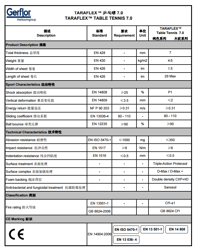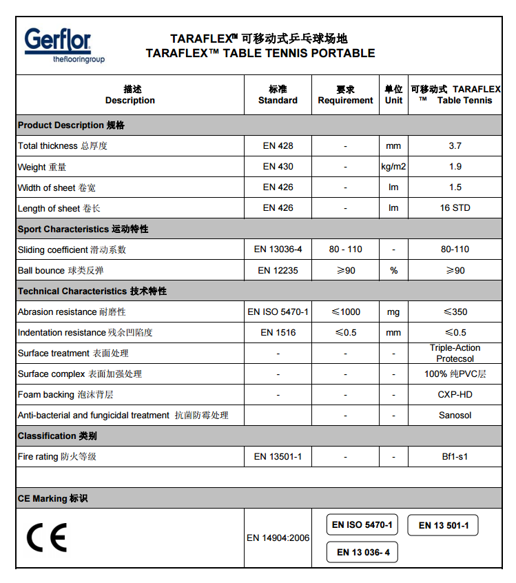 Taraflex?乒乓球運動地板的紅色為國際乒聯(lián)指定色。 Taraflex? 乒乓球運動地板是多層 PVC 地面材料,表層為致密輪壓的乙烯基,底層密閉式細胞泡 沫背層,以無紡玻璃纖維網(wǎng)格作為加強材料。 該產(chǎn)品經(jīng)過 Triple-Action Protecsol 處理(防污,防灼熱擦傷,防阻滯且防滑),同時,該產(chǎn)品每層都 經(jīng)過 Sanosol 處理,具有抗菌防霉的優(yōu)點。 乒乓球 7.0 多層輪壓型 7mm 左右厚度的 PVC 地面材料,表層經(jīng)過 D-Max 加強處理,以無紡玻璃纖維網(wǎng)格作為加 強材料,底層為密閉式細胞雙層泡沫背層 XCP(細胞壁超強化處理)。 該地板符合室內(nèi)運動地板的標(biāo)準 NFP 90 203 和標(biāo)準 NF EN 14-904。 該產(chǎn)品經(jīng)過處理(防污,防灼熱擦傷,防阻滯且防 滑),同時在過程中,產(chǎn)品每層都進行了 Sanosol 抗菌防霉處理。