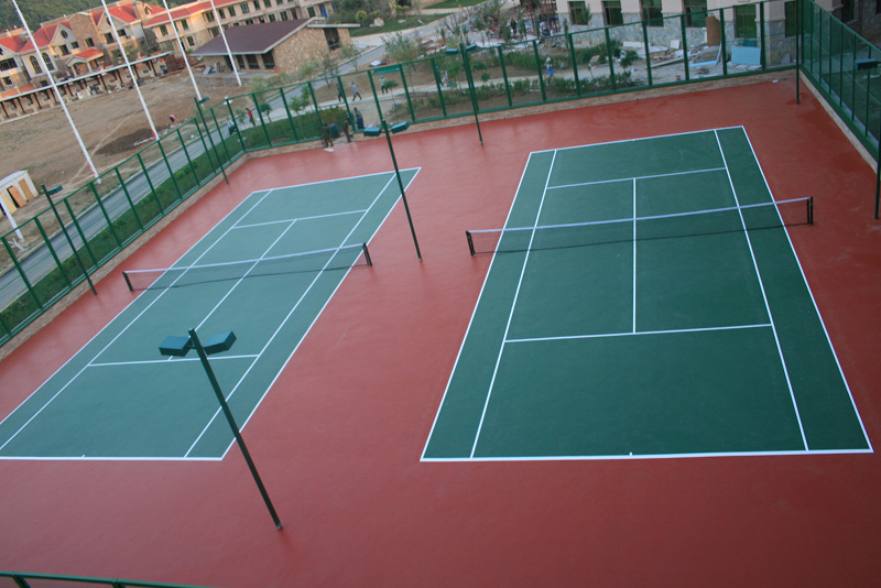 這是一種現(xiàn)場澆鋪用刮板制作在瀝青混凝土上或鋼盤混凝土結(jié)構(gòu)地面上的型材,其工藝主要分為找平結(jié)合層、加強層、耐磨層等多層做法,還有含膠粒的多層做法這種面層材料及工藝的優(yōu)點是平整度高、表面硬度高、耐磨、抗曬、色澤鮮艷、使用壽命長便于管理和維修。這種面層材質(zhì)穩(wěn)定的網(wǎng)球場近年來已開始在**各地普遍采用,管它球速稍快,較之其它類型球場,球的彈跳平衡,球員場上跑動舒服,是一種既可供娛樂打球也可用做正規(guī)比賽的**次網(wǎng)球場地